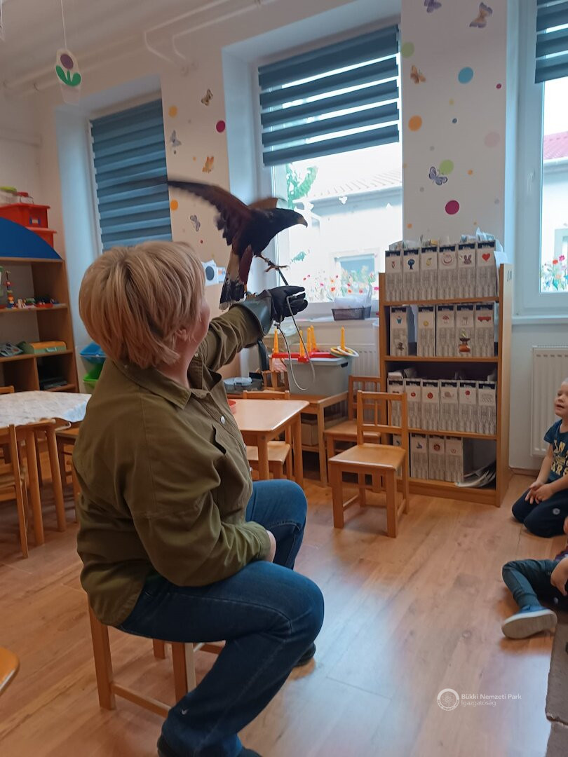Másnap Szügybe vezetett az utunk, ahol az óvodás gyermekek után az iskolába is áthívtak minket. Itt a ragadozó madarakat mutattuk be egy szalagos álölyvvel, ami már szinte "kollégaként" jön-megy a programjaink között. Nógrád vármegyében a gyerekek már hangosan kántálják a nevét, ha meglátják a kismadarat: „Szia Bere!”. Mivel a 2023/2024-es tanév kiemelt témái között volt a levegő és élővilága, ezért a madarakról szóló foglalkozásunk igen népszerű volt a héten.