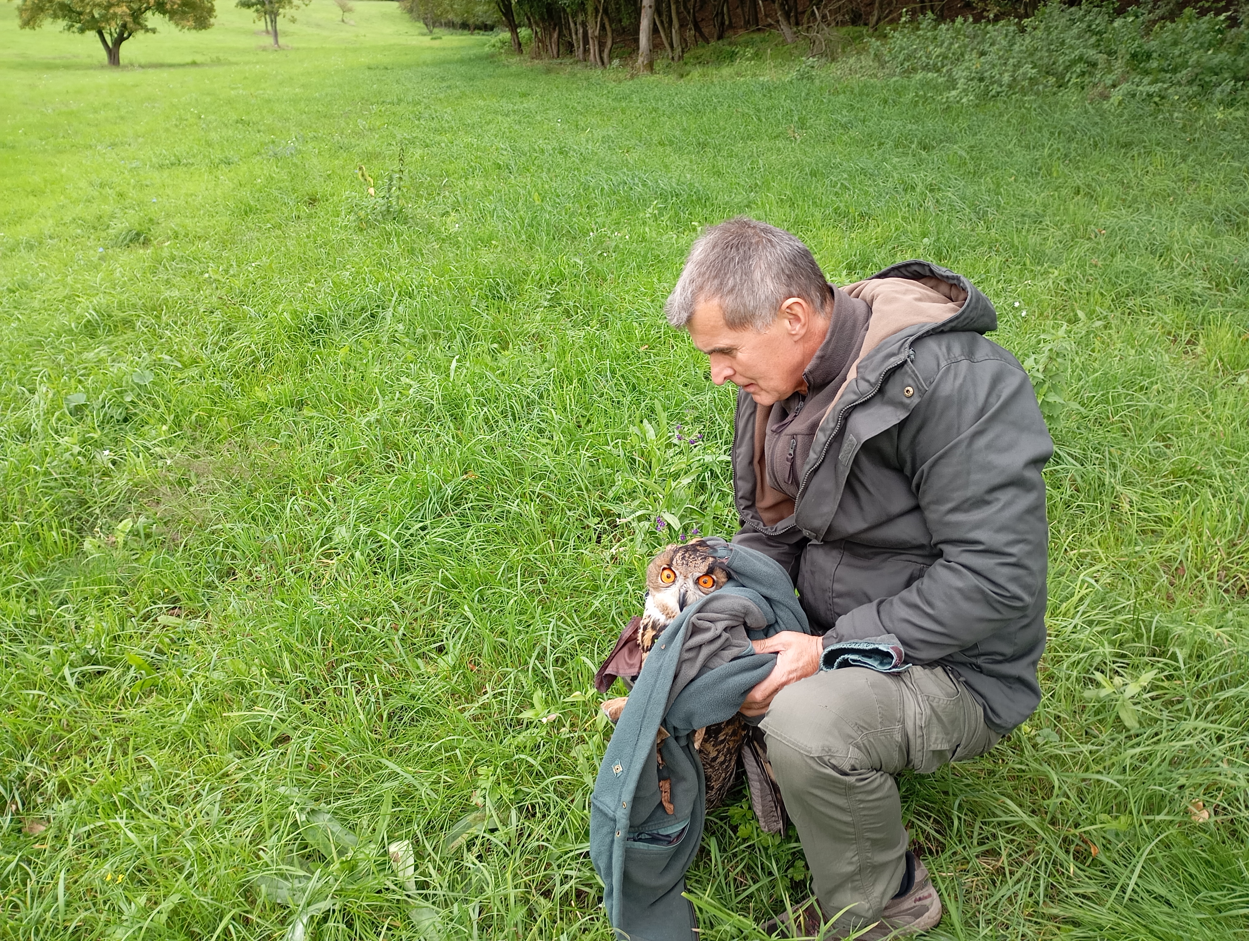 Miután a helyszínen a madarat Bodzás János természetvédelmi őr kollégánk meggyűrűzte, sor kerülhetett a szabadon engedésre. A fiatal uhu nem sokat teketóriázott, határozott ívben az őt jól rejtő lombok közé repült. Nem sokkal később már a fák sűrűjéből hallottuk az erdőlakó kisebb madarak riasztását, ami nyilvánvalóvá tette, hogy hol próbál éppen elrejtőzni ez a frissen elengedett csúcsragadozó. Az elkövetkező napokban, hetekben igyekszünk visszatalálni madarunkat, és reméljük, hogy hamar megtalálja helyét és párját a vadonban.
