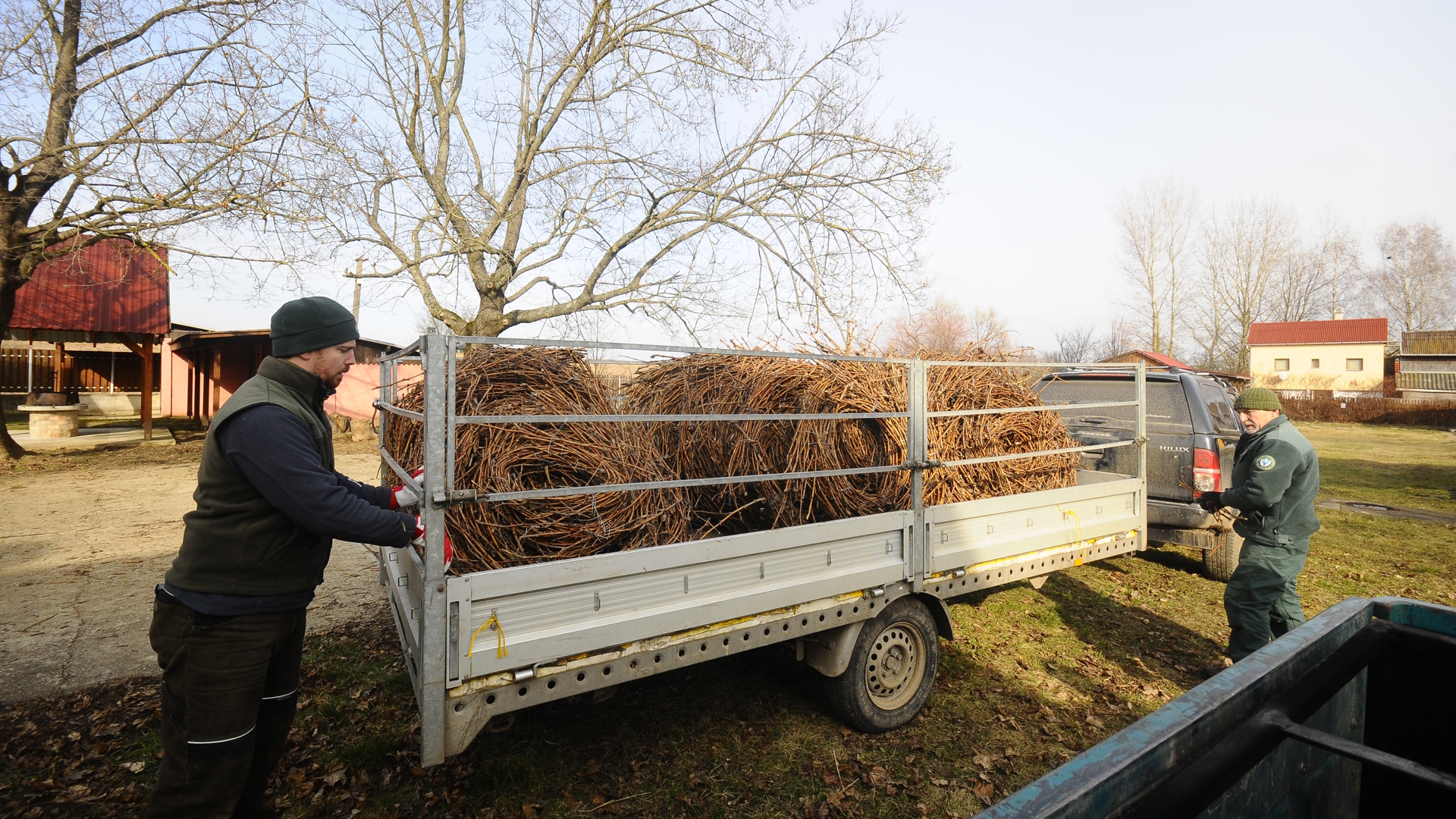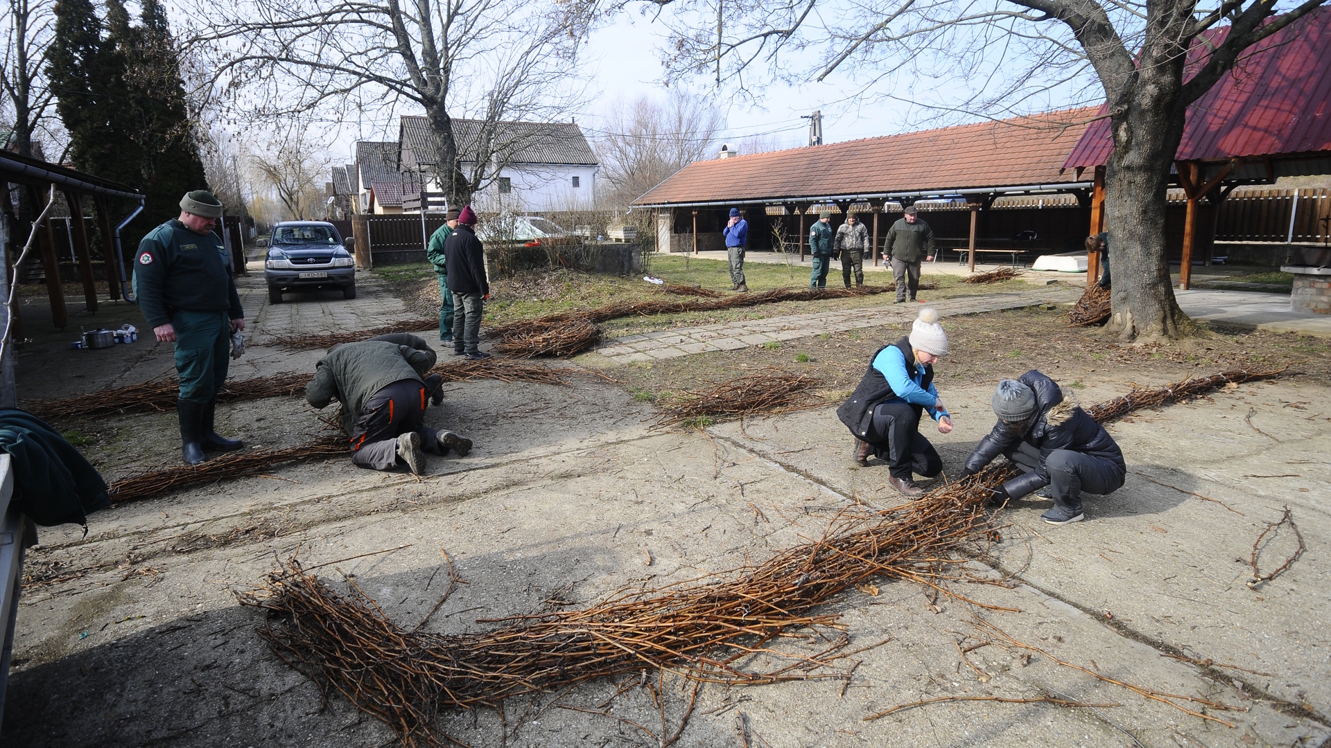 A fészeképítéshez szükséges fészekanyagot, mely valójában szőlővenyige, Tokaj-Hegyaljáról szerezték be munkatársaink, ezúton is köszönjük a felajánlást Bott Vince bodrogkeresztúri szőlősgazdának. Szép, napsütéses időben dolgoztunk a Tiszalúci Önkormányzat Holt-Tisza parti üdülőjének területén.