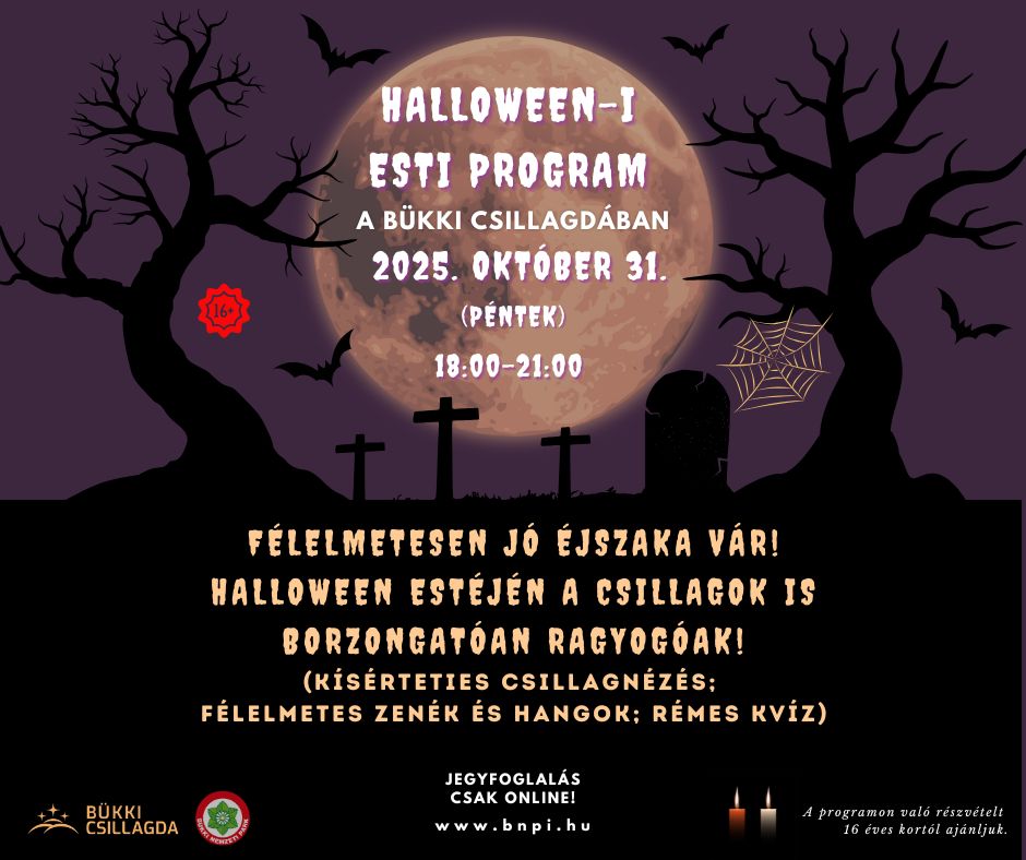 A Halloweenhez kötődő szokások egyre népszerűbbek hazánkban is. Ezekhez kapcsolódva különleges és izgalmas kalandra invitáljuk azokat, akik a csillagok fényén túl szeretik a rejtélyeket is. Október 31-én 18:00 órától félelmetesen jó éjszaka vár a Bükki Csillagdában! Halloween estéjén a csillagok is borzongatóan ragyogóak.