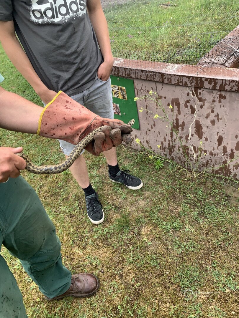 Durch die Freiwilligen vor uns inspiriert, wollten auch wir einen Austausch mit den Freiwilligen aus dem Kiskunság Nationalpark machen. Somit sind wir am Dienstag, den 7. Juni nach Kunpeszér gefahren, ein Ort mit ca. 700 Einwohnern. Wir wurden von den Freiwilligen Lara und Jakob und ihrem Ansprechpartner Csaba abgeholt und mit dem Jeep zum fünf Kilometer entfernten Forsthaus gefahren. Dieses liegt mitten im Wald und dient als Unterkunft, Treffpunkt, um den Arbeitstag zu beginnen und Arbeitsplatz für Aufgaben am Computer. Am nächsten Tag zeigten uns Lara und Jakob die Umgebung und Orte, an denen sie bisher gearbeitet hatten. Im Allgemeinen ist die Region sehr flach und an vielen Stellen auch deutlich trockener als im Bükk. Großflächige Wälder gibt es kaum, die Landschaft ist vorrangig von Graslandschaften geprägt. Diese sind Teil der UNESCO Biosphärenreservate und beinhalten eine große Diversität an Fauna und Flora. Am Nachmittag hat Csaba uns dann noch ihm persönlich wichtige Orte im Nationalpark gezeigt und verschiedene Aspekte des Ökosystems erklärt. Der Kiskunság Nationalpark befasst sich weniger mit Tourismus und deutlich mehr mit dem Erhalt der Diversität. An den nächsten zwei Tagen waren wir unter anderem noch in Kecskemét, haben einen Ort für verletzte Schlangen besucht und haben uns ein Adlernest angesehen. Zwischendurch hat es in Strömen geregnet, weshalb wir drinnen Karten spielten.